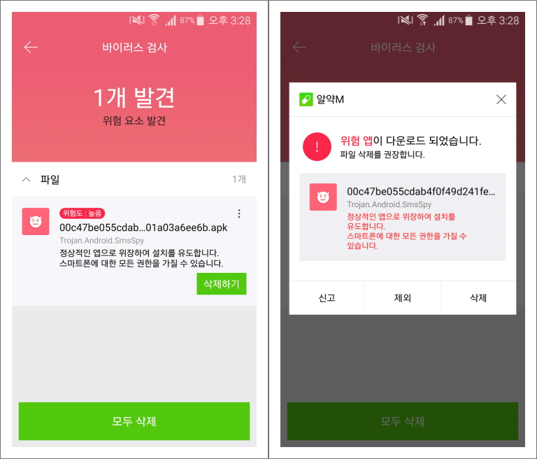 문자 내의 URL 링크를 클릭하지 않거나 다운로드한 악성 앱을 설치하지 않으면 됩니다. 그리고 알약M과 같이 신뢰할 수 있는 백신 앱을 설치하여 사용하는 것도 피해를 예방하는 데 도움이 됩니다.