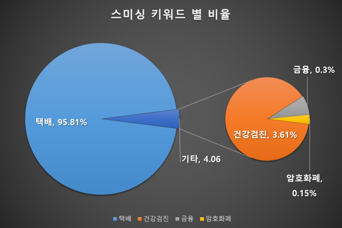 이어서 건강 검진 관련 스미싱 문자가 3.61%를 차지하고 있으며 나머지 스미싱 문자의 발견 비율은 0.45% 정도입니다.