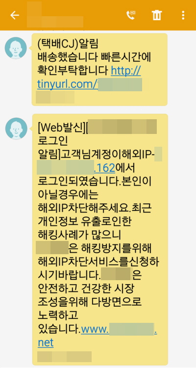 | [Web발신][OOO][OOO 로그인 알림]고객님계정이해외IP-xxx.xxx.xxx.162에서 로그인되였습니다.본인이아닐경우에는 해외IP차단해주세요.최근 개인정보 유출로인한 해킹사례가 많으니 OOO은 해킹방지를위해 해외IP차단서비스를신청하시기바랍니다.OOO은 안전하고 건강한 시장 조성을위해 다방면으로 노력하고 있습니다.www.xxxxxxxx[.]net | 60% |