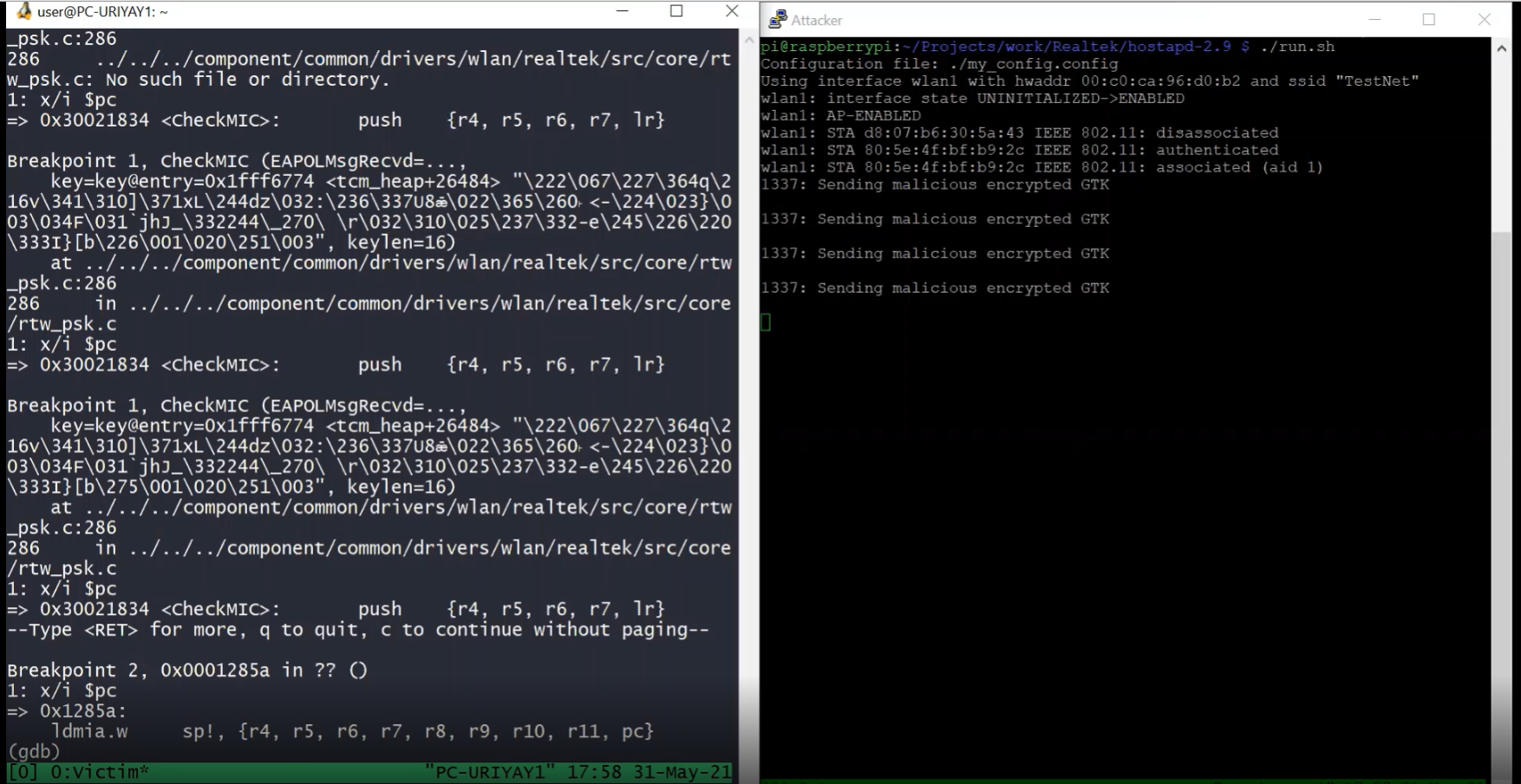 연구원들이 게시한 PoC 영상의 오른쪽 창에서 “악성 암호화된 GTK 보내기”라는 문구를 확인할 수 있습니다.
