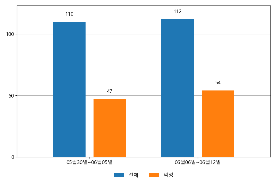 지난주 이메일 유입량은 총 112건이고 그중 악성은 54건으로 48.21%의 비율을 보였습니다. 악성 이메일의 경우 그 전주 47건 대비 54건으로 7건이 증가했습니다.