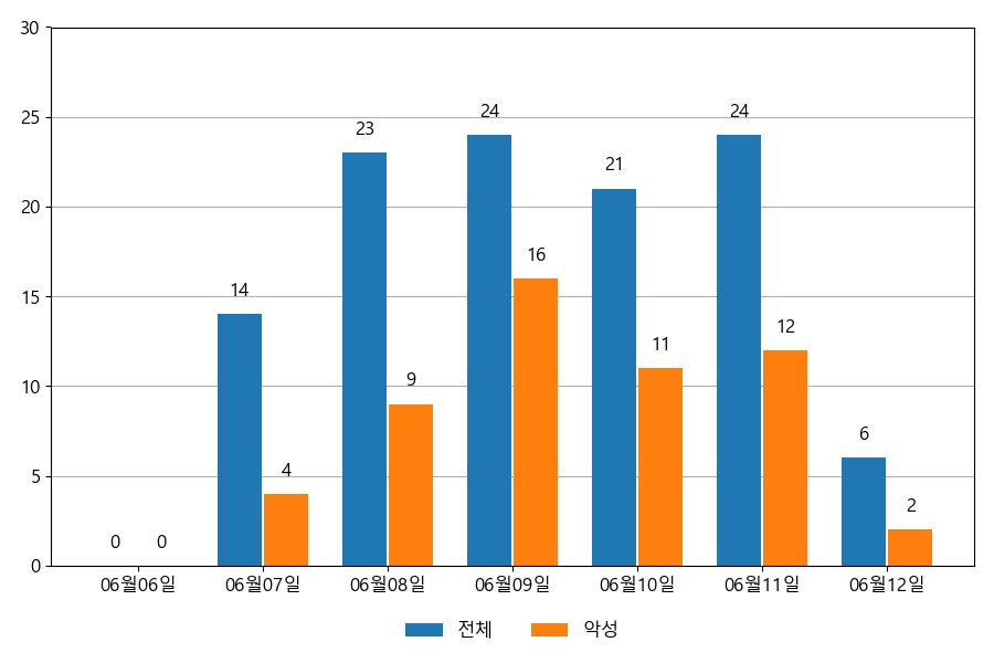 일일 유입량은 하루 최저 6건(악성 2건)에서 최대 24건(악성 16건)으로 일별 편차를 확인할 수 있습니다.