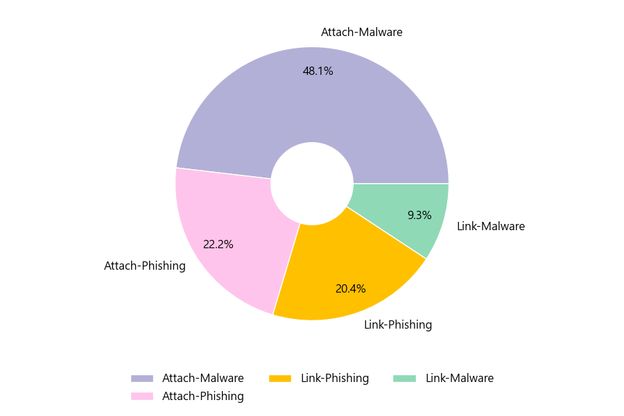 악성 이메일을 유형별로 살펴보면 54건 중 Attach-Malware형이 48.1%로 가장 많았고 뒤이어 Attach-Phishing형이 22.2%를 나타냈습니다.