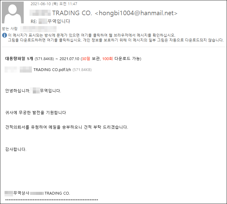 이번주 Pick으로는 국내 무역회사 견적서를 사칭하여 악성코드가 설치되도록 유도하는 이메일을 선정했습니다. 특히 국내 많은 기업에 유포된 정황이 확인되어 주의가 필요합니다. 더 많은 내용은 Threat Inside 웹 서비스를 통해 확인 가능합니다.