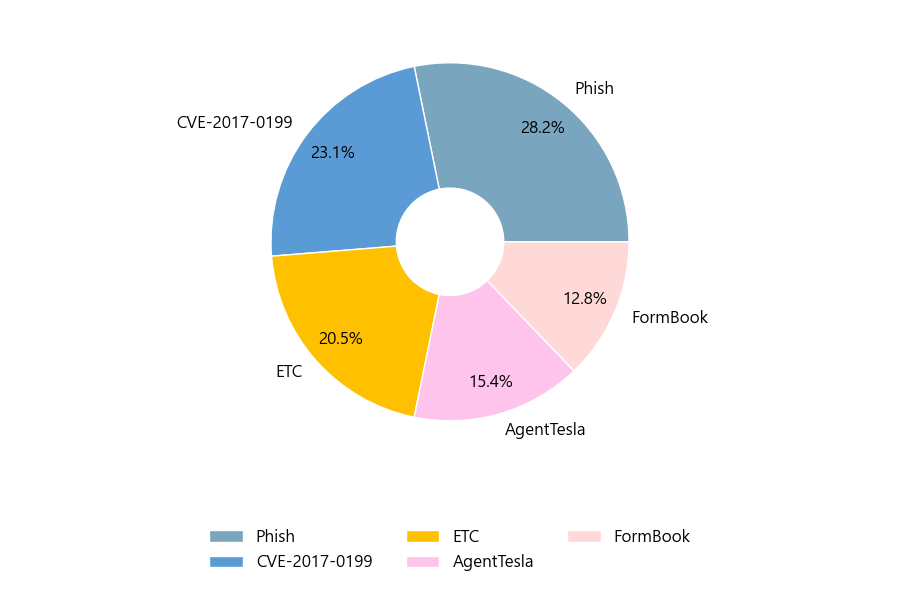 첨부파일은 ‘Phish’형태가 28.2%로 제일 큰 비중을 차지했고 뒤이어 ‘CVE-2017-0199’, ‘ETC’가 각각 23.1%, 20.5%의 비중을 차지했습니다.