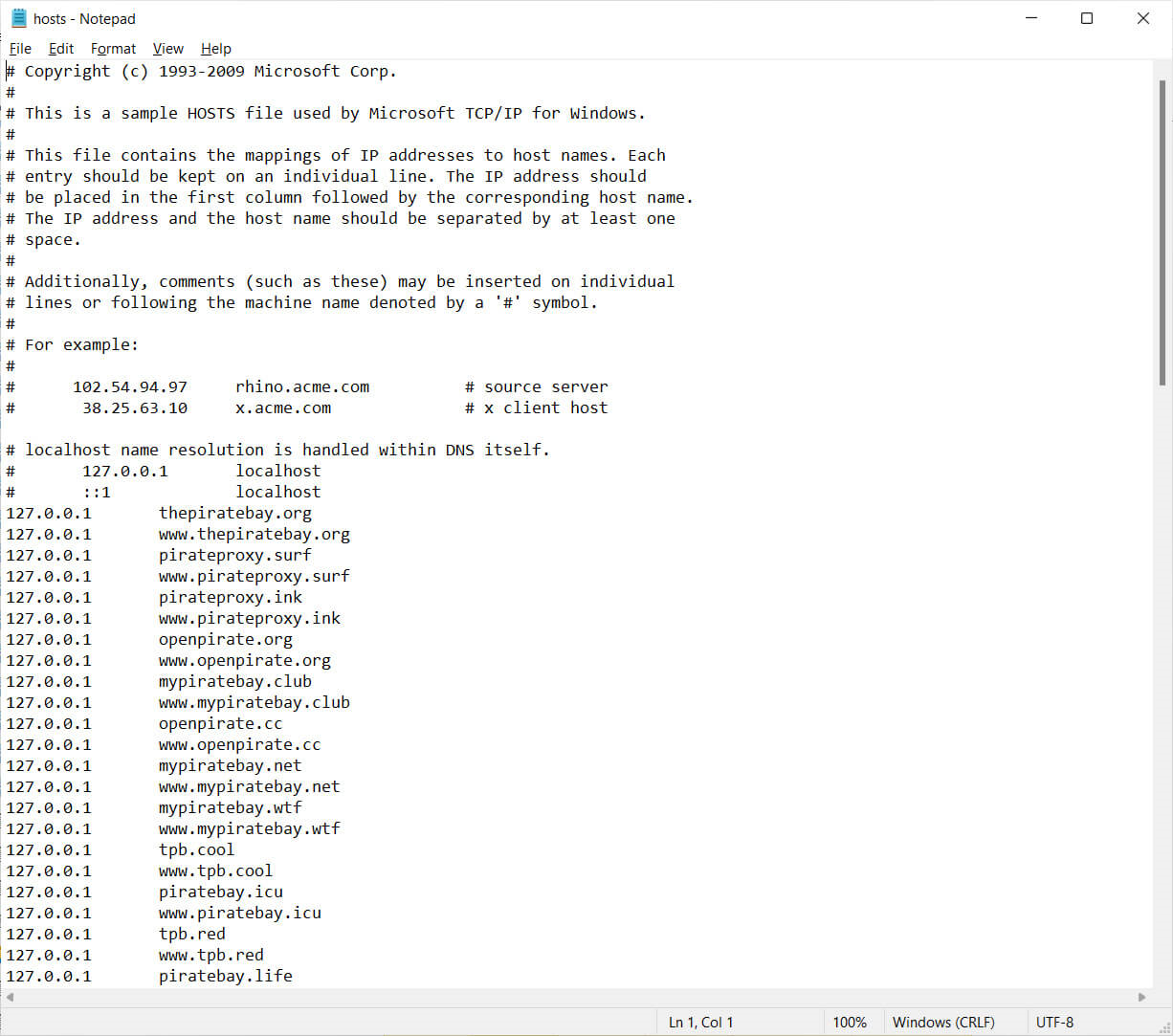 사용자가 악성코드 파일을 실행하면, 이는 윈도우 호스트 파일을 수정해 The Pirate Bay와 관련된 사이트가 127.0.0.1을 가리키도록 하는 수 많은 항목을 추가합니다.