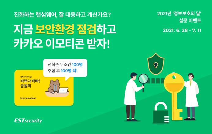 이스트시큐리티가 2021년 7월, 10번째 정보보호의 달을 맞아 '보안환경 점검' 설문 이벤트를 준비했습니다. 점점 진화하는 랜섬웨어가 기승을 부리고 있는 요즘, 간단한 설문을 통해 함께 보안환경을 점검해보시고, 총 200분께 드리는 경품의 기회도 놓치지 마세요!
