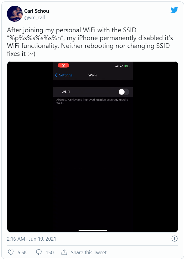 이 이슈는 보안 연구원인 Carl Schou가 발견했습니다. 그는 "%p%s%s%s%s%n"라는 이름의 Wi-Fi 네트워크에 연결한 후 아이폰의 Wi-Fi 기능이 영구적으로 비활성화된 것을 발견했습니다. 기기를 재부팅하거나 네트워크 이름(예: 서비스 세트 식별자나 SSID)을 변경한 후에도 마찬가지였습니다.