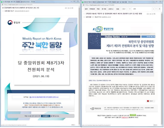 두 공격 모두 거의 동일한 시기에 ‘북한의 당 중앙위원회 제8기 제3차 전원회의 분석’ 주제와 관련된 내용처럼 수신자를 현혹하는 공통점이 발견됐습니다.