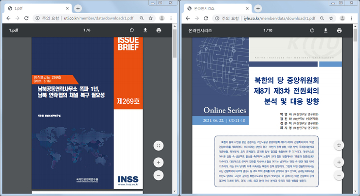 공격자가 발송한 이메일 본문에는 마치 통일부나 통일연구원에서 공식 발행한 것처럼 교묘하게 도용된 화면이 사용됐고, HWP나 PDF 문서 전문이 첨부된 것처럼 화면을 보여주며 클릭을 유도합니다.