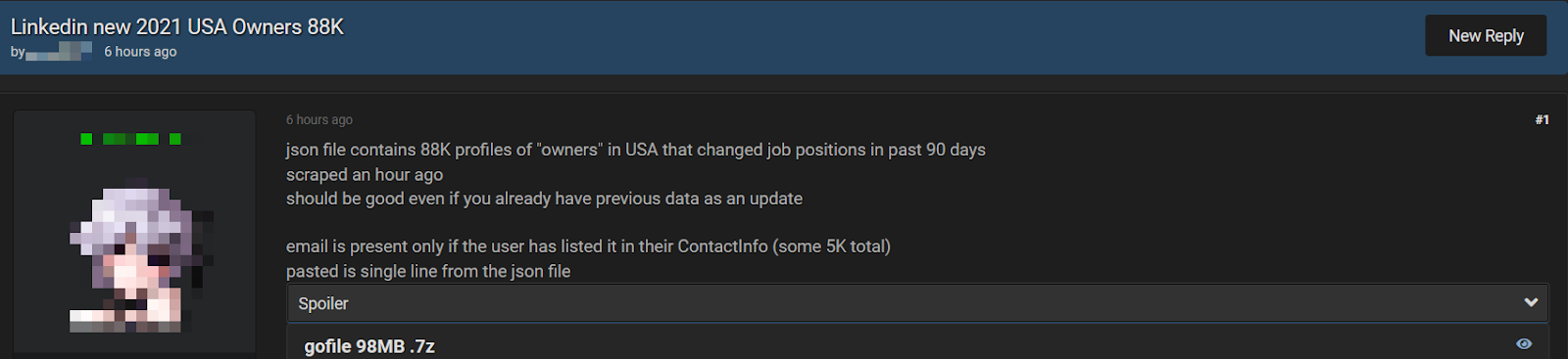 게시자에 따르면, “지난 90일 동안 직위를 변경한” 미국 기업주의 데이터를 모은 것으로 나타났습니다. 해당 데이터베이스는 성명, 이메일 주소, 직장 정보, 사용자가 LinkedIn 프로필에 공개한 기타 데이터를 포함하고 있었습니다. 이 정보를 담은 아카이브 파일은 해커 포럼에 게시되어 누구나 열람할 수 있었습니다.