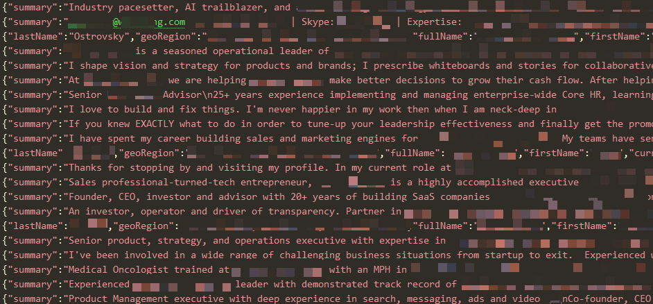 공유된 파일의 샘플에 따르면, 해당 데이터베이스에는 미국 사업주 88,000명의 LinkedIn 프로필에서 가져온 아래 정보가 포함되어 있었습니다.