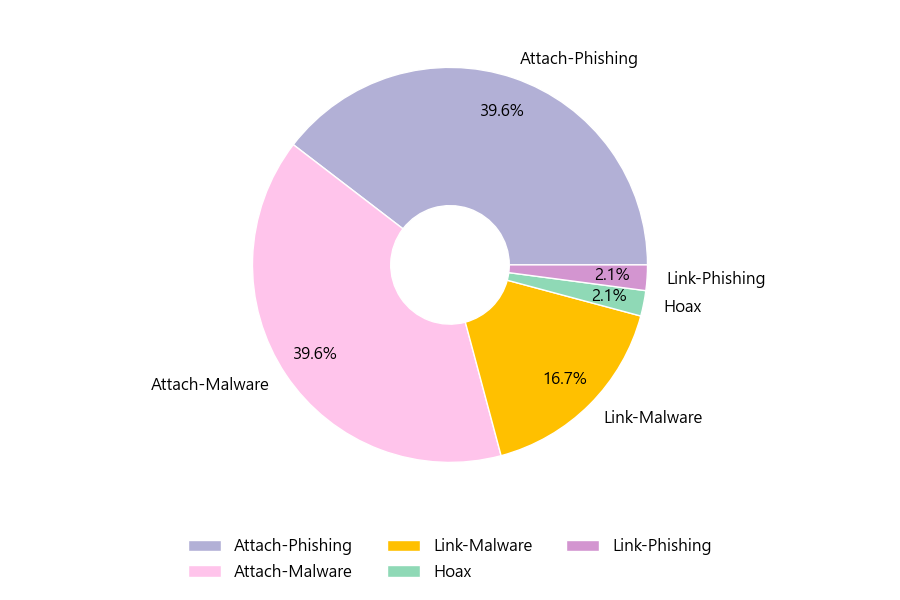 악성 이메일을 유형별로 살펴보면 48건 중 Attach-Phishing형이 39.6%로 가장 많았고 뒤이어 Attach-Malware형이 39.6%를 나타냈습니다.