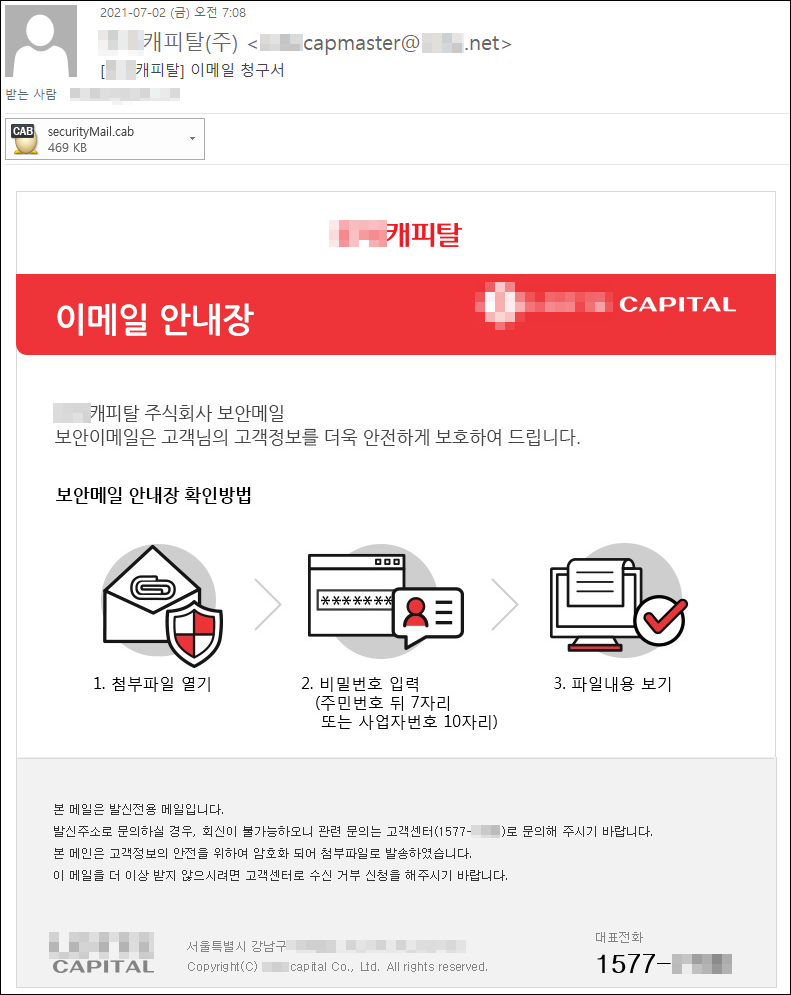 이번주 Pick으로는 국내 캐피탈 회사의 보안메일을 사칭한 악성 이메일을 선정했습니다. 특히 이번 이메일은 얼마전 은행관리자 사칭 이메일과 유사하기 때문에 앞으로 이런 형태의 위협이 지속될 것으로 예측됩니다. 유사 이메일에 대한 자세한 내용은 다음 글을 확인하시기 바랍니다.