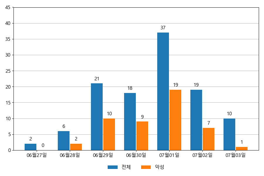 일일 유입량은 하루 최저 2건(악성 1건)에서 최대 37건(악성 19건)으로 일별 편차를 확인할 수 있습니다.