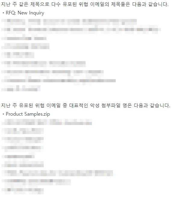 지난주 이메일 유입량은 총 113건이고 그중 악성은 48건으로 42.48%의 비율을 보였습니다. 악성 이메일의 경우 그 전주 73건 대비 48건으로 25건이 감소했습니다.