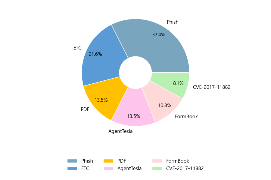 첨부파일은 ‘Phish’형태가 32.4%로 제일 큰 비중을 차지했고 뒤이어 ‘ETC’, ‘PDF’가 각각 21.6%, 13.5%의 비중을 차지했습니다.