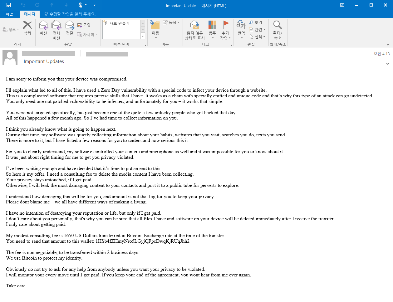 이메일은 영문으로 작성되었으며, 제로데이 취약점을 악용하여 사용자 PC를 해킹하였다는 내용과 함께, 이메일에 포함된 비트코인 주소로 1650달러 상당의 비트코인을 보내라고 협박하는 내용을 포함하고 있습니다.