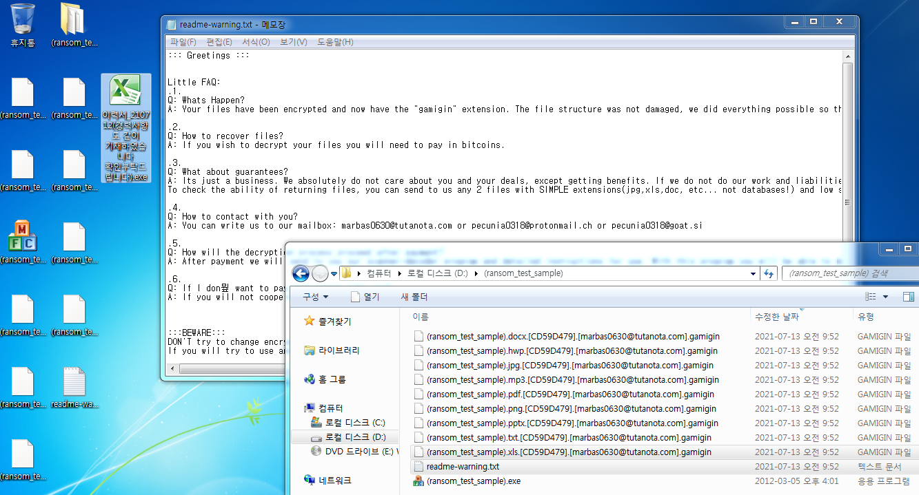 프로세스를 종료 후 사용자들의 PC 파일들에 대해 암호화를 진행하며, 파일명을 “원본 파일명.[<Random 8자>].[marbas0630@tutanota.com].gamigin”으로 변경합니다.