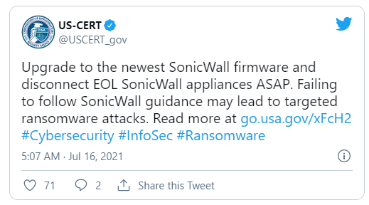 CISA 또한 SonicWall SMA(Secure Mobile Access) 100 시리즈 및 SRA(Secure Remote Access) 제품 내 알려진 취약점을 악용하려 시도하는 랜섬웨어 공격에 대해 경고했습니다.