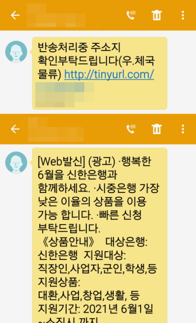 | 고객님 주소에 택배 보냈으니 빠른확인하세요 hxxps://tinyurl[.]com/xxxxxx | 21% |