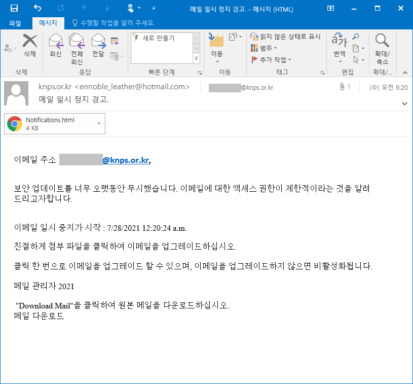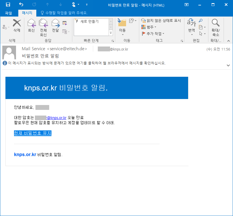 이번 피싱메일은 @knps.or.kr 이메일 주소를 사용하는 국립공원공단 직원들을 대상으로 유포되었습니다. 이메일은 '메일 일시 정지 경고', '비밀번호 만료 알림'이라는 제목으로 유포되고 있으며, 해당 피싱메일의 목적은 계정정보 탈취입니다.