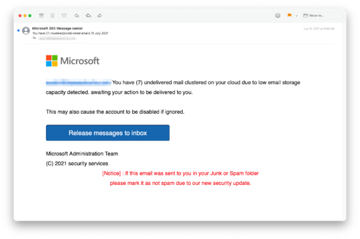 해당 이메일은 “마이크로소프트 365 메시지 센터”에서 온 것으로 위장하며, 클라우드 내 “이메일 저장소 공간 부족”으로 인해 도달이 실패한 이메일을 수신한 사용자에게 경고하는 내용이었습니다.