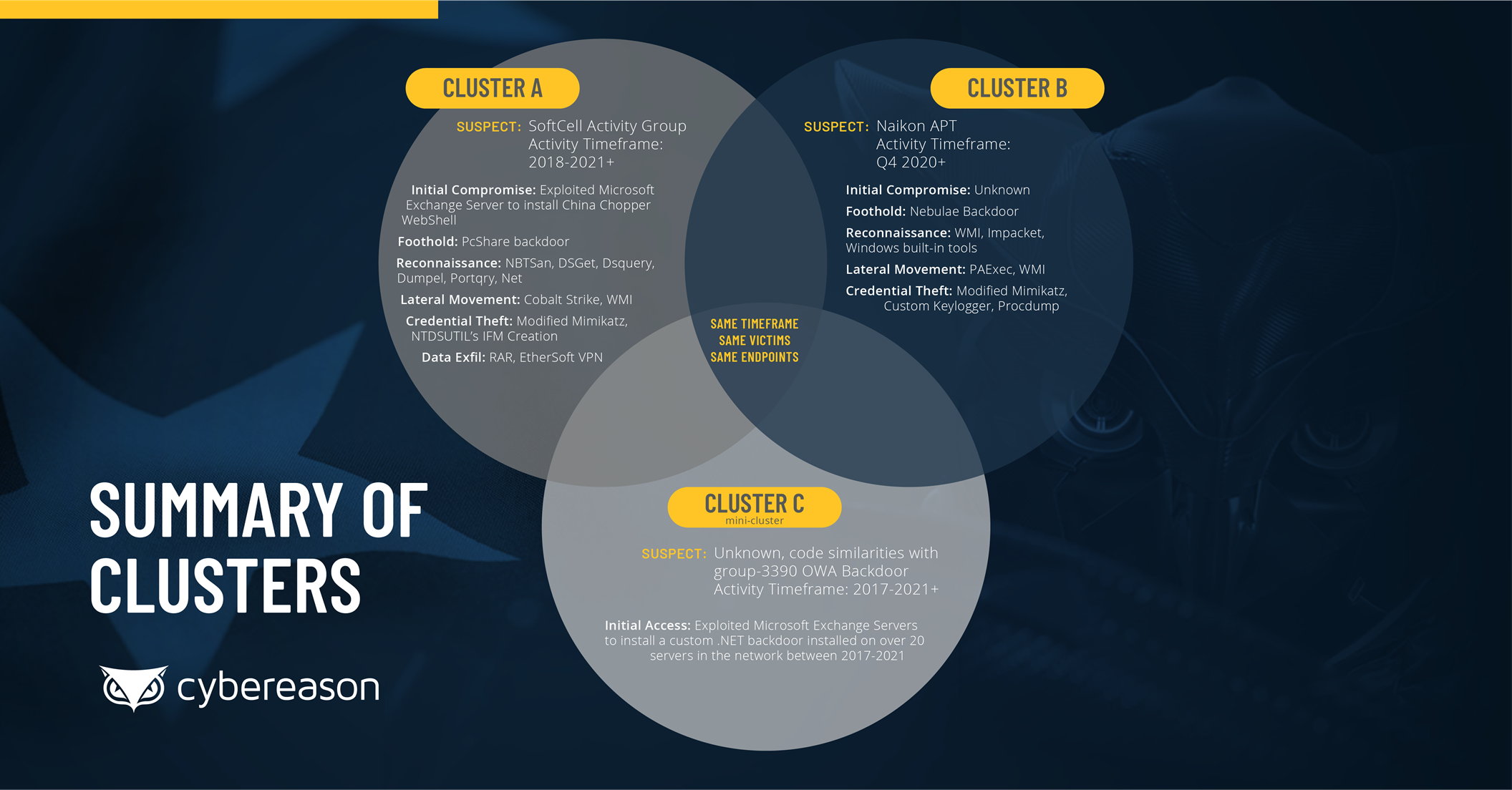 이 클러스터 3개는 Soft Cell(Gallium), Naikon APT(APT30 또는 Lotus Panda), TG-3390(APT27 또는 Emissary Panda)로 알려진 중국 관련 APT 그룹과 관련이 있는 것으로 드러났습니다.