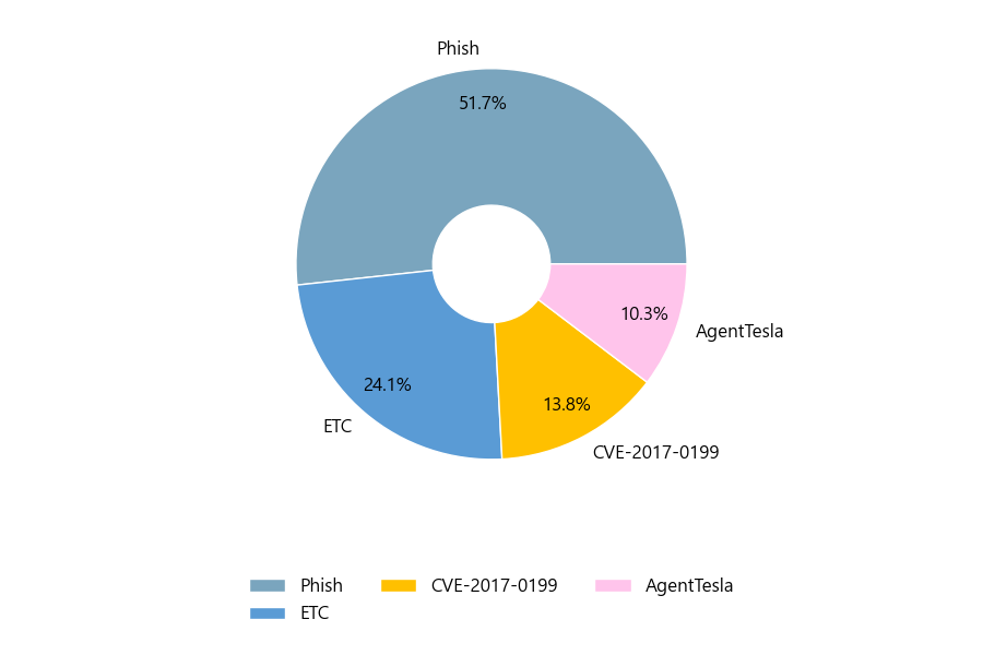 첨부파일은 ‘Phish’형태가 51.7%로 제일 큰 비중을 차지했고 뒤이어 ‘ETC’, ‘CVE-2017-0199’가 각각 24.1%, 13.8%의 비중을 차지했습니다.