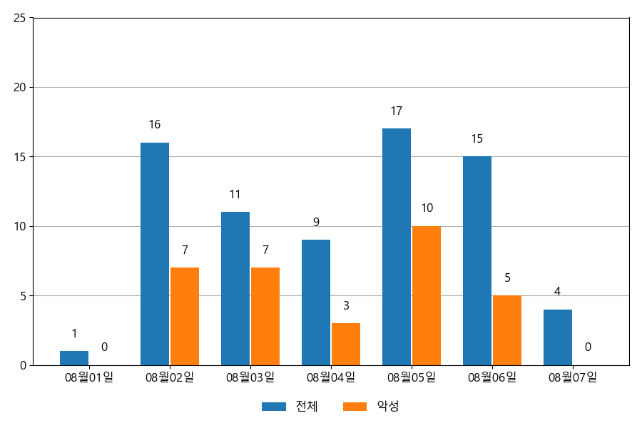 일일 유입량은 하루 최저 1건(악성 3건)에서 최대 17건(악성 10건)으로 일별 편차를 확인할 수 있습니다.