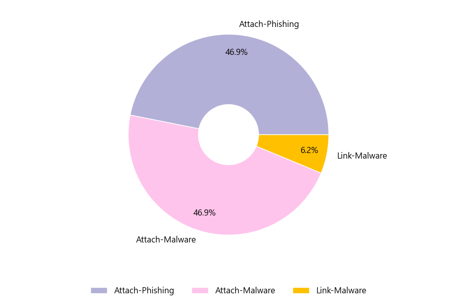 악성 이메일을 유형별로 살펴보면 32건 중 Attach-Phishing형이 46.9%로 가장 많았고 뒤이어 Attach-Malware형이 46.9%를 나타냈습니다.