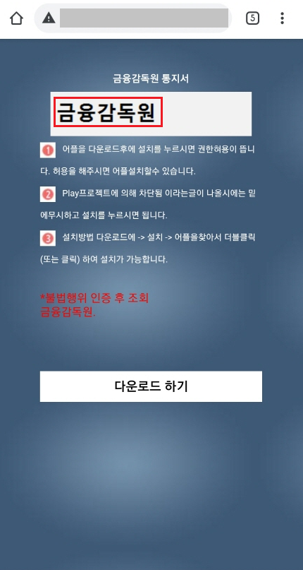 사용자가 이름 및 생년월일까지 입력하면 다음과 같이 악성 앱을 내려받을 수 있는 페이지로 이동하게 됩니다. 하지만 해당 페이지에서도 어색한 부분을 발견하실 수 있습니다.