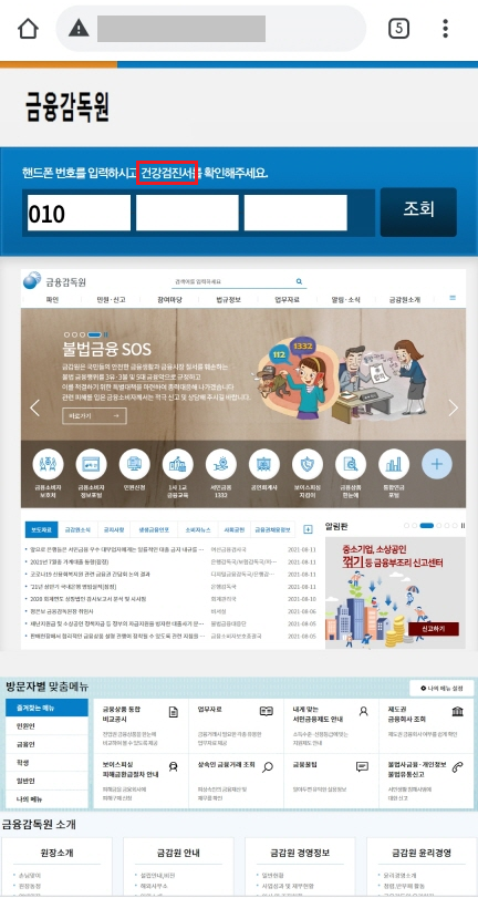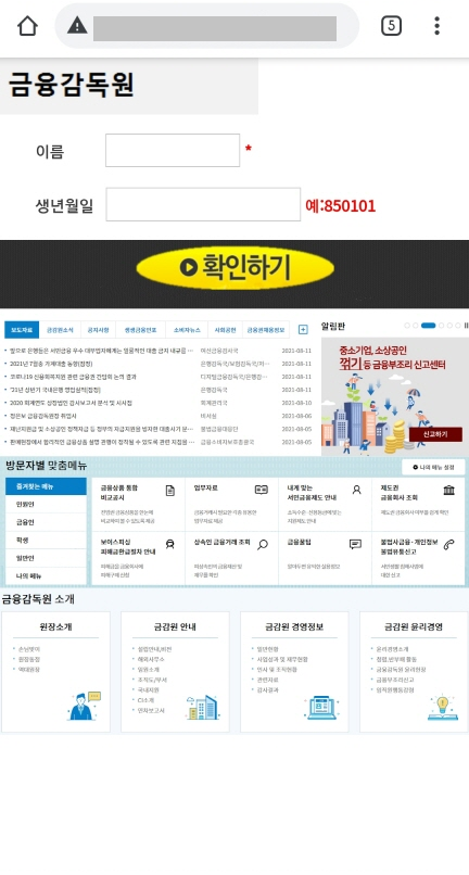 금융감독원 사칭 스미싱 링크를 클릭하면 다음과 같은 화면으로 랜딩됩니다. 기존에 유포하였던 건강검진 스미싱에 사용하였던 검진모아 피싱 페이지에서 일부만 수정하여 사용하였기 때문에 미처 수정하지 못한 문구도 발견할 수 있습니다.