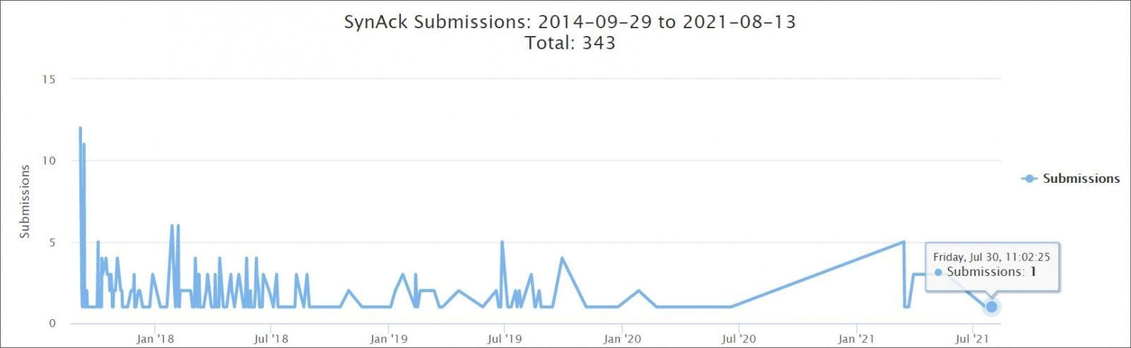 SynAck 랜섬웨어는 2017년 8월, 9월부터 활동을 시작했지만, 크게 활발하지는 않았습니다. 이들은 2018년 가장 많이 활동했으나 2019년 말부터 서서히 줄어들었습니다.