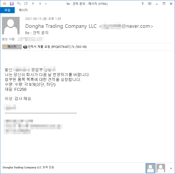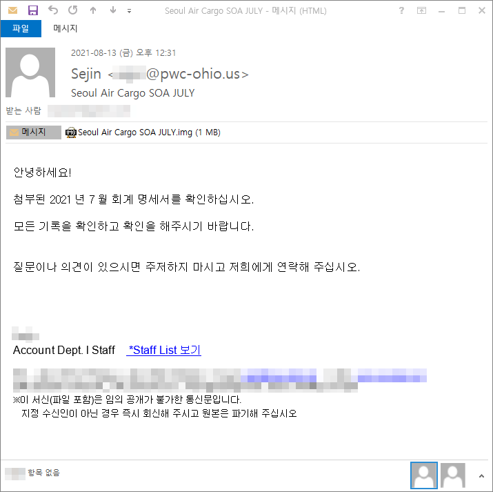 내용은 회계 명세서와 견적서를 위장하고있으며, 첨부파일에는 악성코드가 포함되어 있습니다.