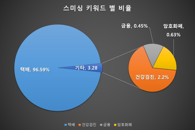 이어서 건강 검진 관련 스미싱 문자가 2.2%, 암호화폐 관련 스미싱 문자가 0.63%, 금융 관련 스미싱 문자가 0.45%를 차지하고 있으며 나머지 문자의 발견 비율은 1.13% 정도를 차지하고 있습니다.
