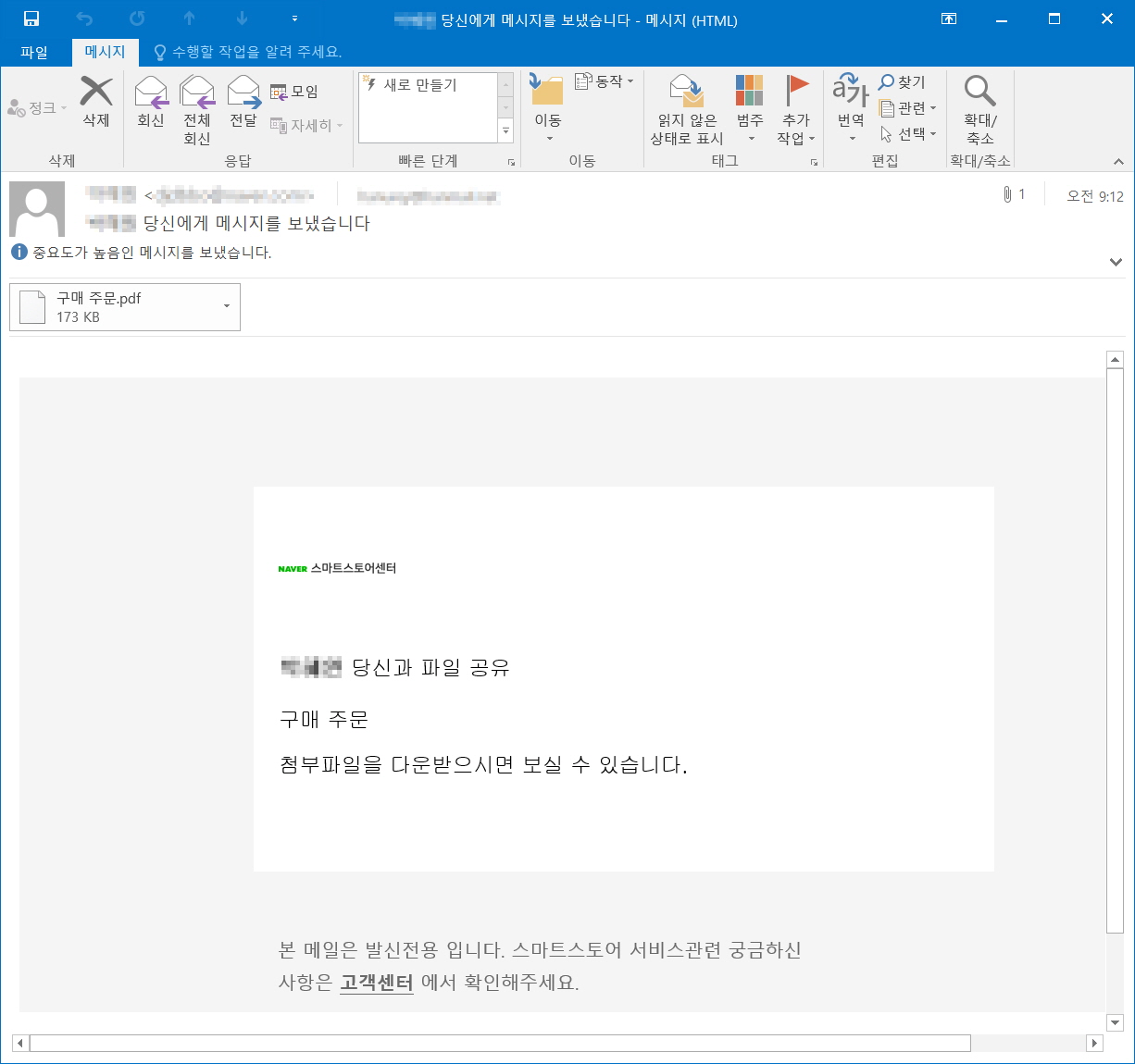 첨부파일이 포함된 네이버 스마트스토어를 위장한 피싱 메일이 발견되어 사용자들의 주의가 필요합니다.