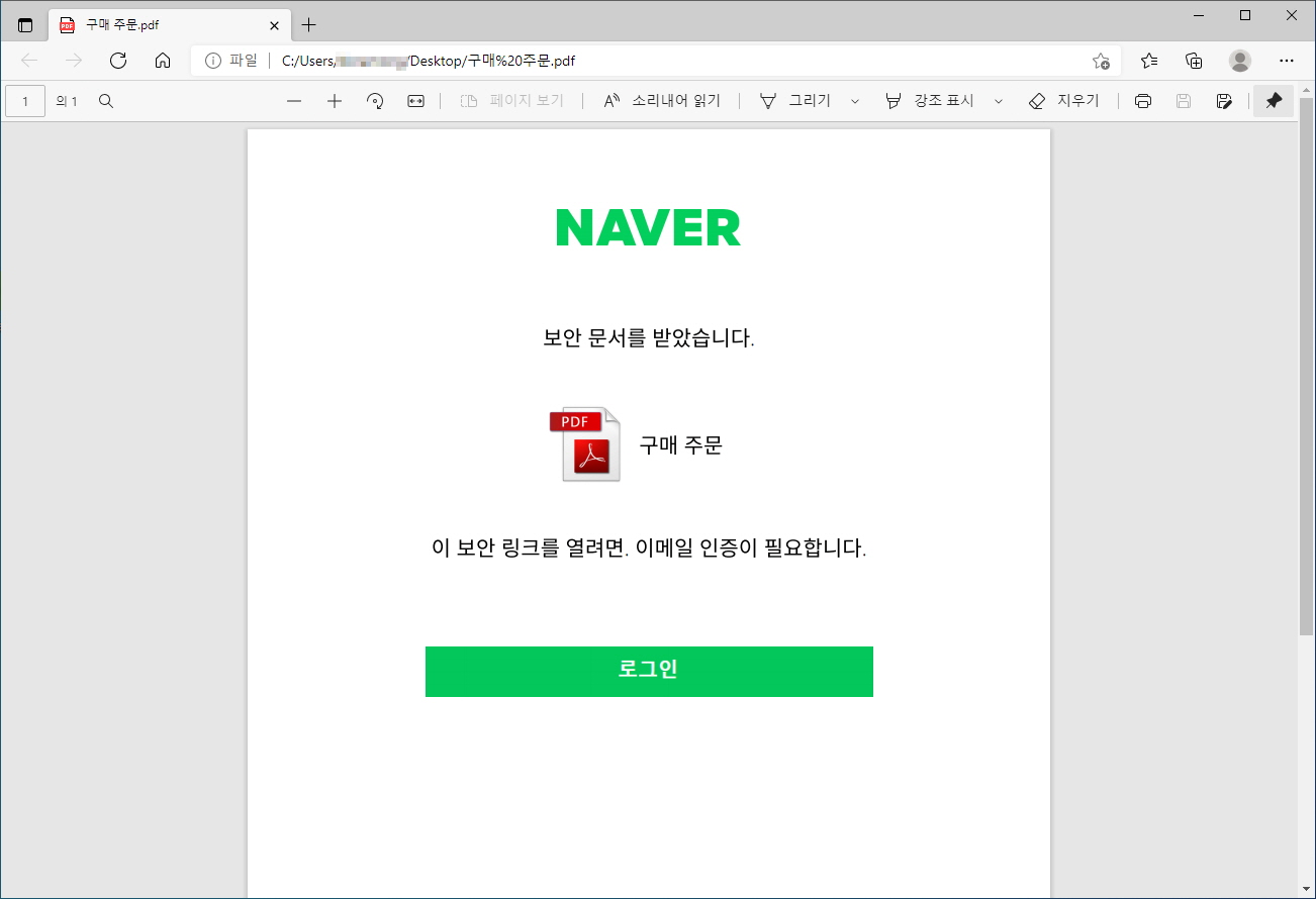 이번에 발견된 이메일은, 기존의 네이버 피싱들과는 다르게 pdf를 위장한 첨부파일을 포함하고 있습니다.
