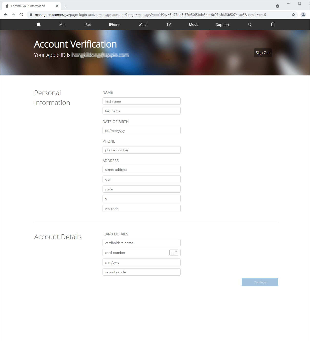 사용자가 계정확인을 누르면 이름을 포함한 상세 개인정보 입력을 요구하는 폼이 나오며 정보 입력을 유도합니다. 입력을 유도하는 정보 중에는 신용카드 정보도 포함되어 있습니다.