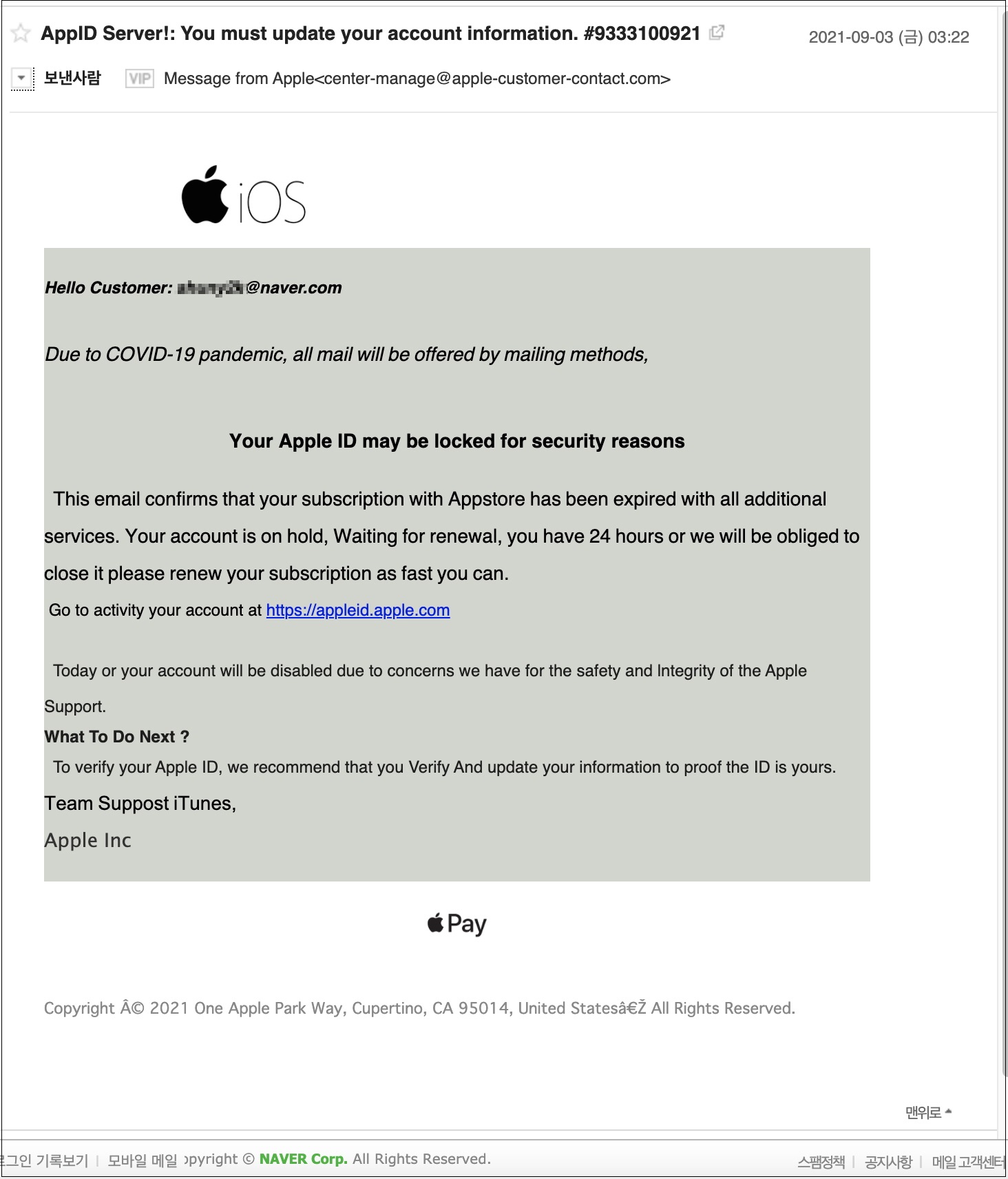 해당 메일은 'AppID Server!: You must update your account information. #9333100921'라는 제목으로 유포되었습니다.