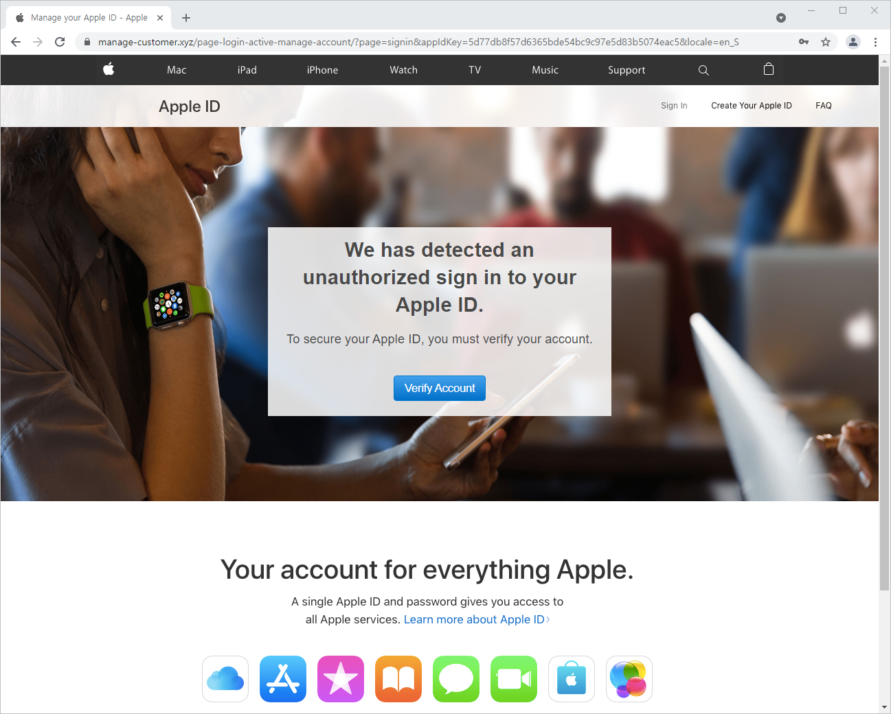 피싱 페이지는 실제 애플 공식 홈페이지와 매우 유사하게 제작되어 있으며, Apple ID 입력창이 있어 계정정보 입력을 유도합니다.
