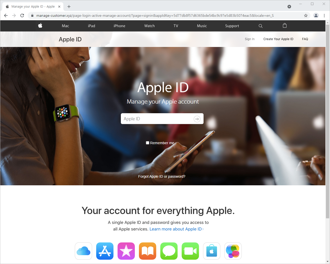 피싱 페이지는 실제 애플 공식 홈페이지와 매우 유사하게 제작되어 있으며, Apple ID 입력창이 있어 계정정보 입력을 유도합니다.