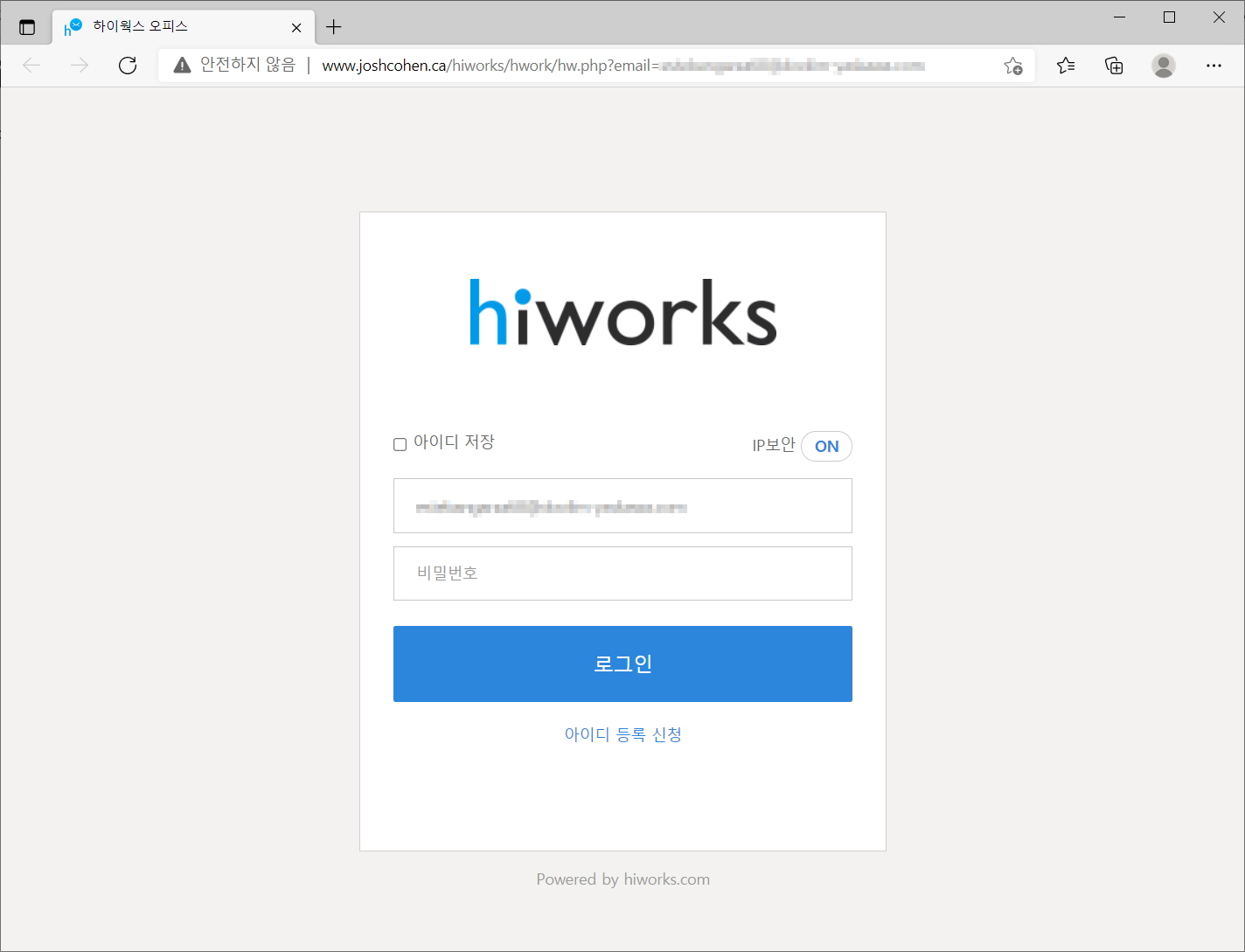 사용자가 메세지 검토를 클릭하면, 하이웍스 로그인 페이지로 위장한 피싱 페이지로 넘어갑니다.
