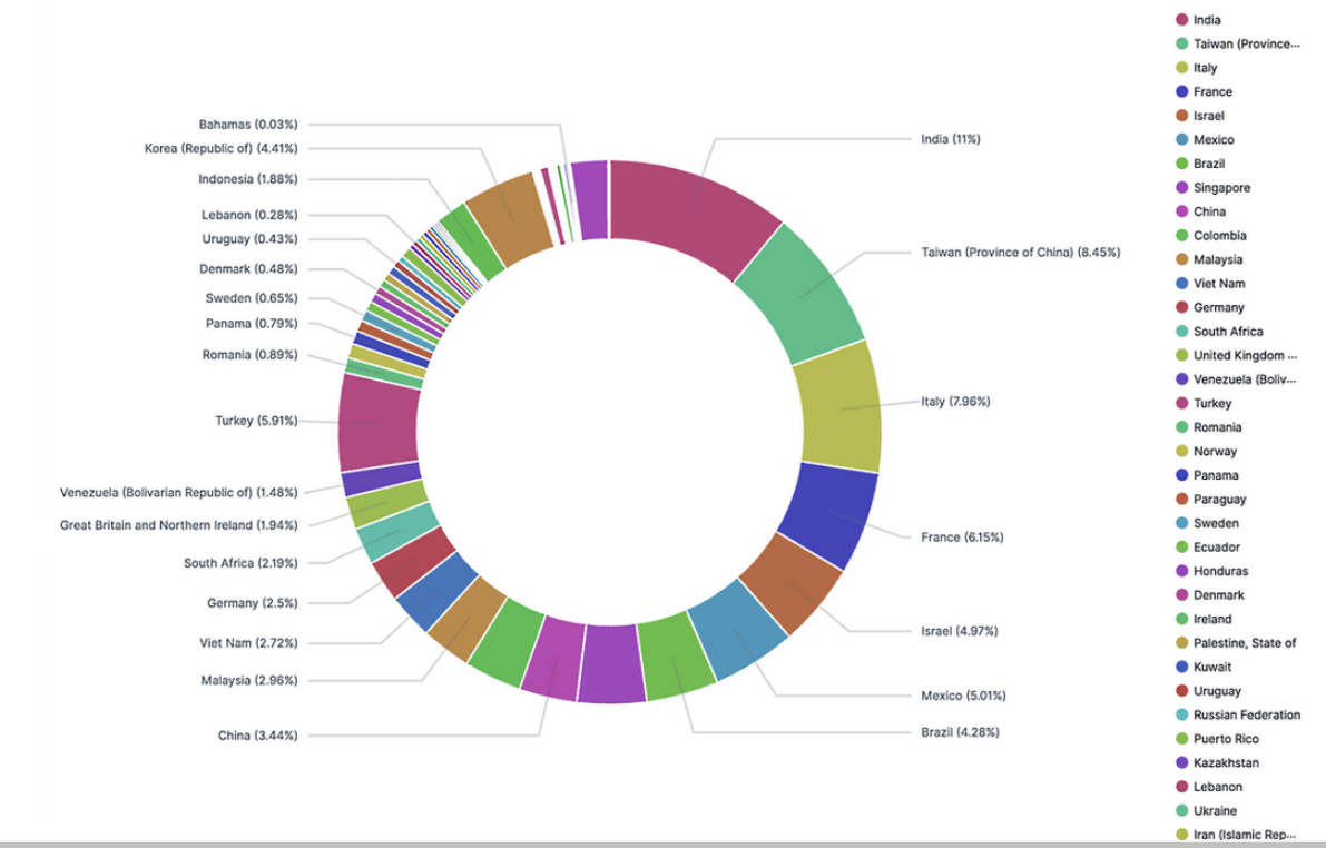 해당 유출된 데이터를 분석한 위협 인텔리전스 회사인 Advanced Intel의 연구원들은 Fortinet VPN SSL의 지리적 분포도를 공개했습니다. 74개국의 피해 기업 22,500곳 중 2,959곳이 미국 법인으로 나타났습니다.