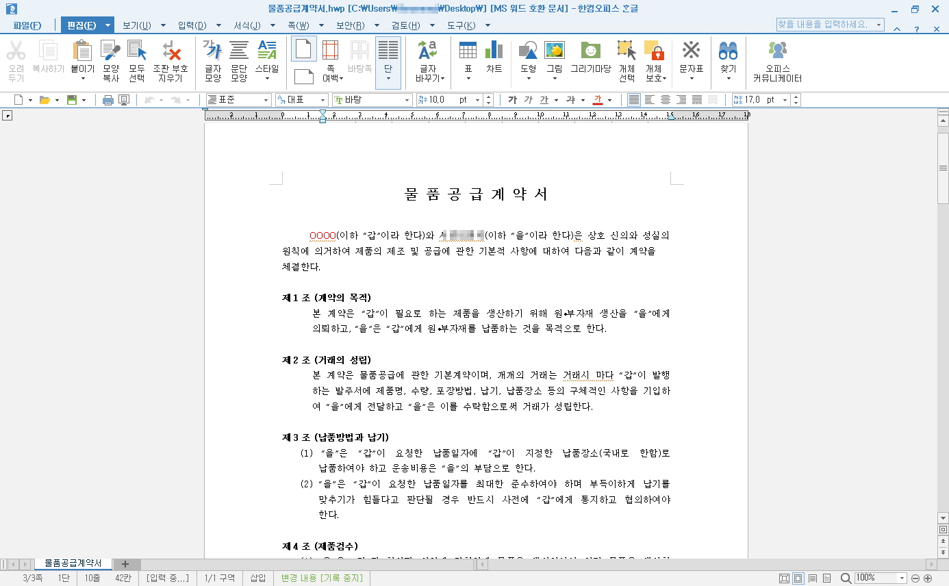 한글 파일은 정상 파일로, 내부에는 일반적인 계약서 내용이 작성되어 있습니다.