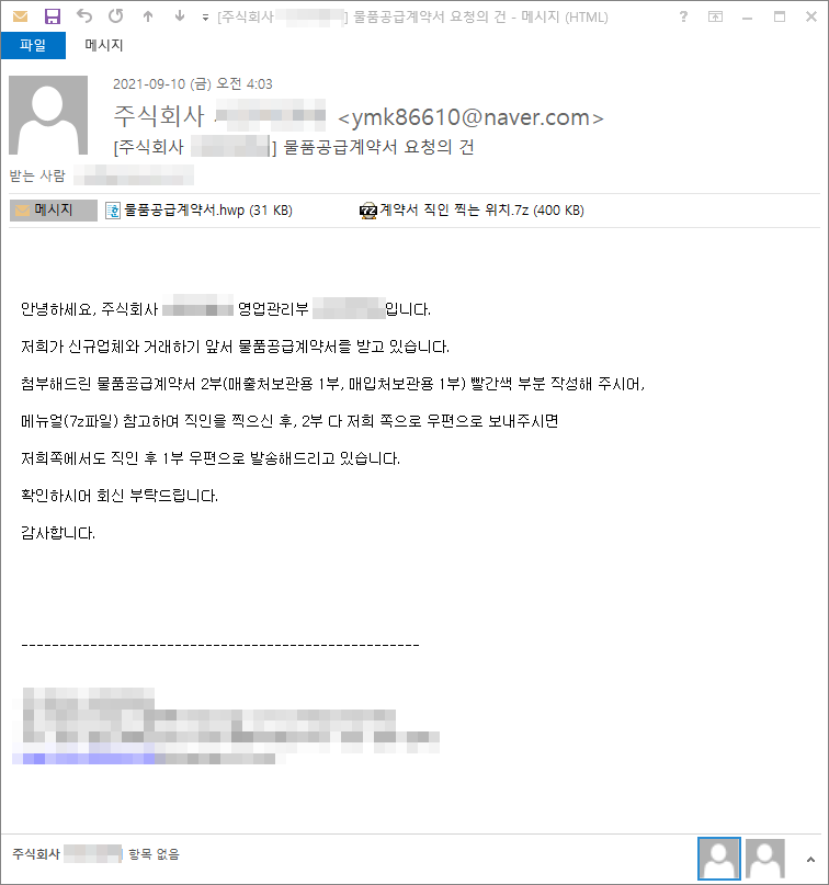 이메일 내용은 거래를 위하여 물품공급계약서를 받고 있다며, 첨부되어있는 '물품공급계약서' 파일명의 한글 파일을 실행하도록 유도합니다. 또한 직인 찍는 메뉴얼이라면서 '계약서 직인 찍는 위치.7z' 압축파일을 실행하도록 유도합니다.
