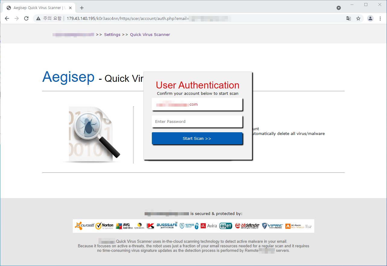 사용자가 이메일 바이러스 검사를 위해 본문에 기재 된 스캐닝 주소를 클릭하면 로그인 계정과 패스워드를 탈취하는 피싱 사이트로 이동하게 됩니다.