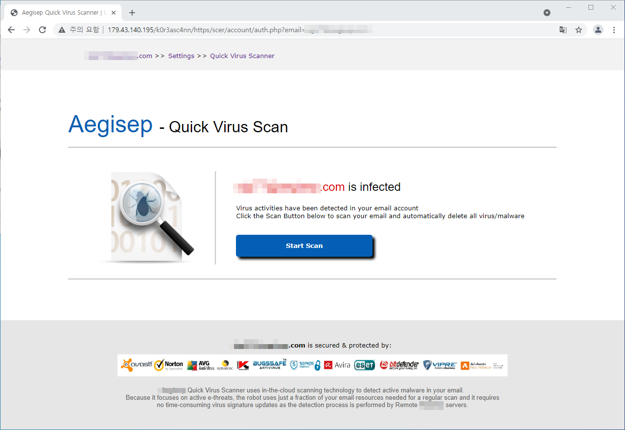 피싱사이트에 접속되면 사용자의 이메일이 감염되었다는 문구가 표시되며, 정상적인 바이러스 스캔 사이트인 것처럼 정교하게 제작되어 있습니다.