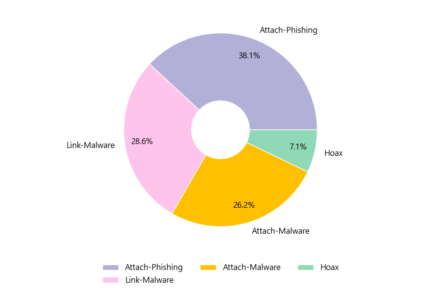악성 이메일을 유형별로 살펴보면 42건 중 Attach-Phishing형이 38.1%로 가장 많았고 뒤이어 Link-Malware형이 28.6%를 나타냈습니다.